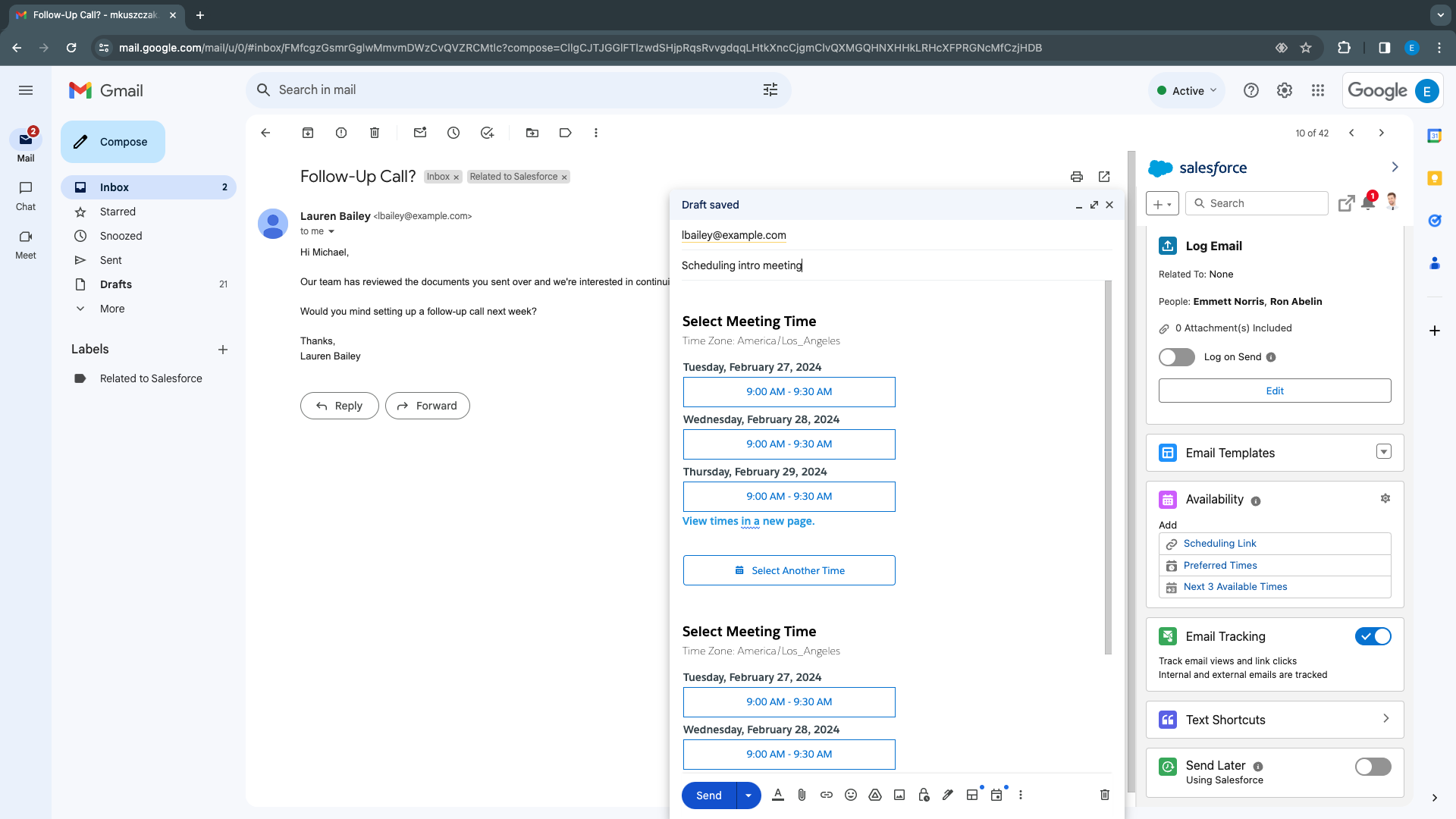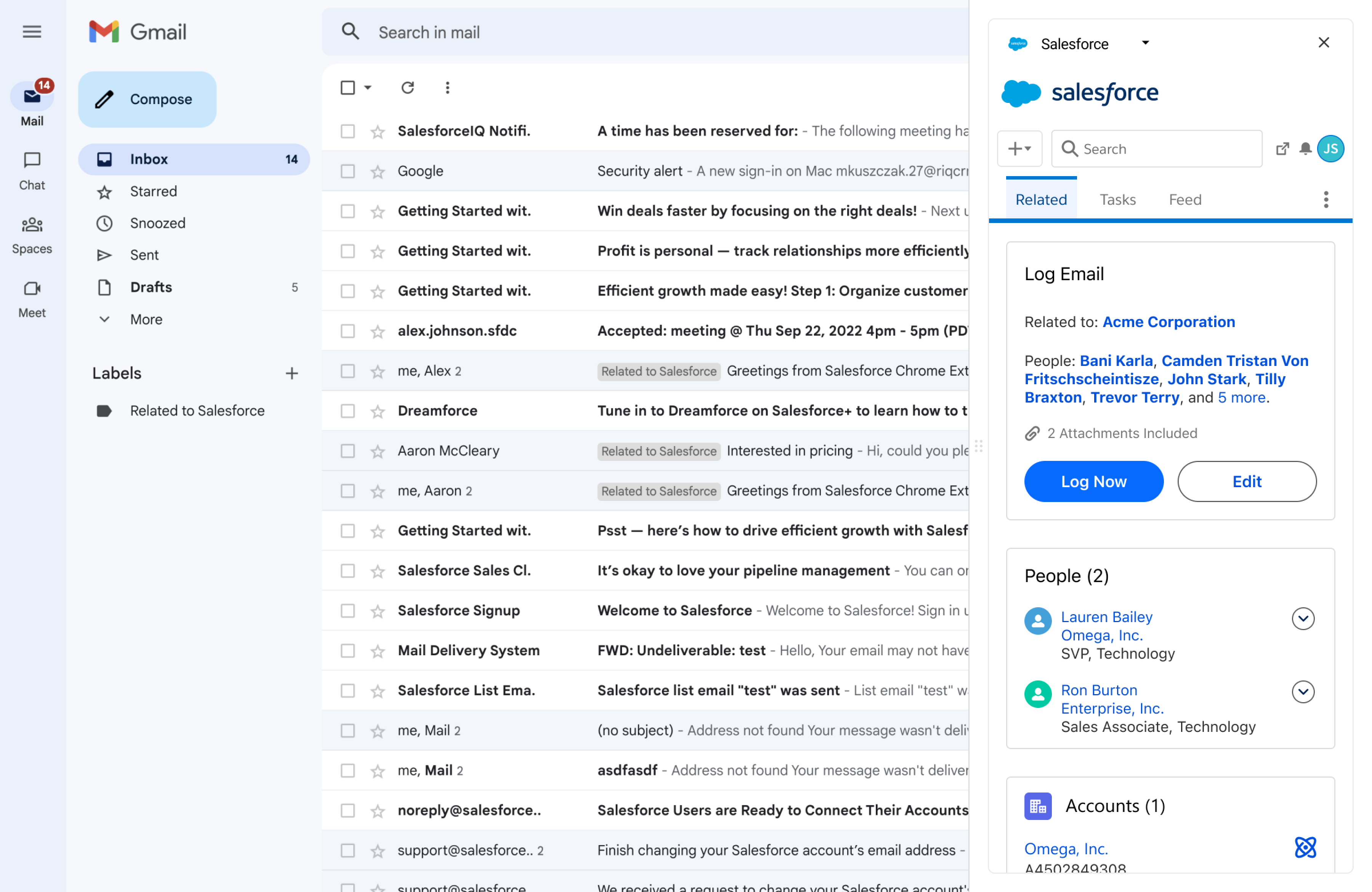 Verwenden Sie Produktivitätsfunktionen in E-Mails, beispielsweise die Planung der E-Mail-Zustellung und die Anzeige relevanter Salesforce-Datensätze neben Ihren E-Mails und Ereignissen. Die Inbox-Funktionen sind in den Outlook- und Gmail-Integrationen verfügbar.